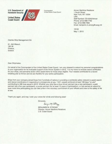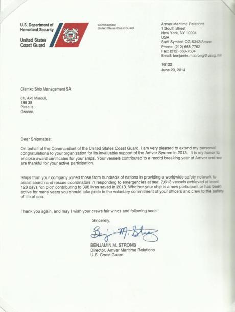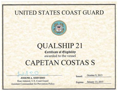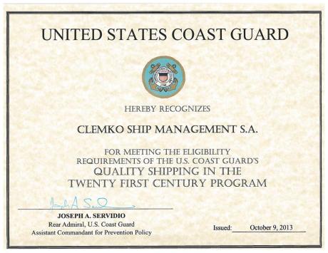 The U.S. Coast Guard has recognized CLEMKO SHIP MANAGEMENT S.A. for meeting the eligibility requirement of the US Coast Guard's Quality shipping in the 21st century (Q21) and has also provided a Qualship 21 certificate for the M/V Androusa and M/V Capetan Costas S.
