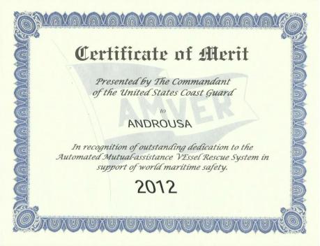 M/Vs ANDROUSA and GOLDEN ELPIS have been awarded with AMVER certificates for the year of 2012 for their contribution to the worldwide safety network in order to assist search and rescue coordinators in responding to emergencies at sea.