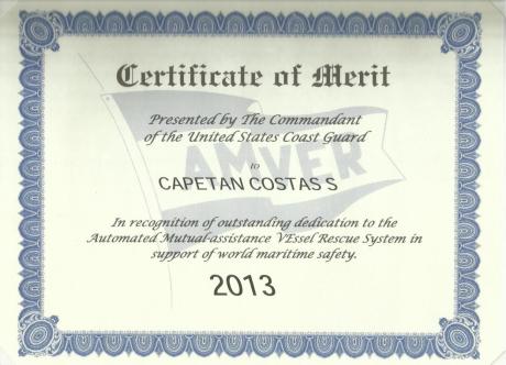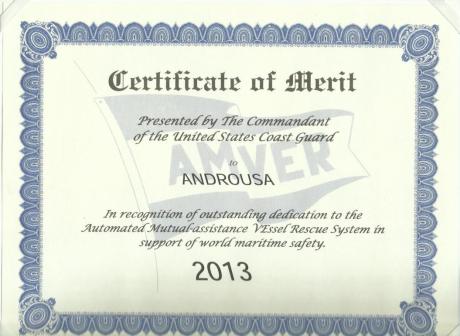 M/Vs ANDROUSA and CAPETAN COSTAS S have been awarded with AMVER certificates for the year of 2013 for their contribution to the worldwide safety network in order to assist search and rescue coordinators in responding to emergencies at sea.