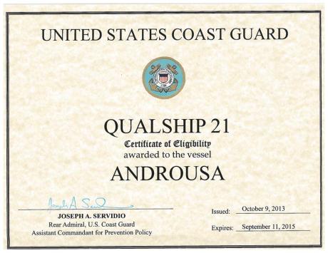 The U.S. Coast Guard has recognized CLEMKO SHIP MANAGEMENT S.A. for meeting the eligibility requirement of the US Coast Guard's Quality shipping in the 21st century (Q21) and has also provided a Qualship 21 certificate for the M/V Androusa and M/V Capetan Costas S.